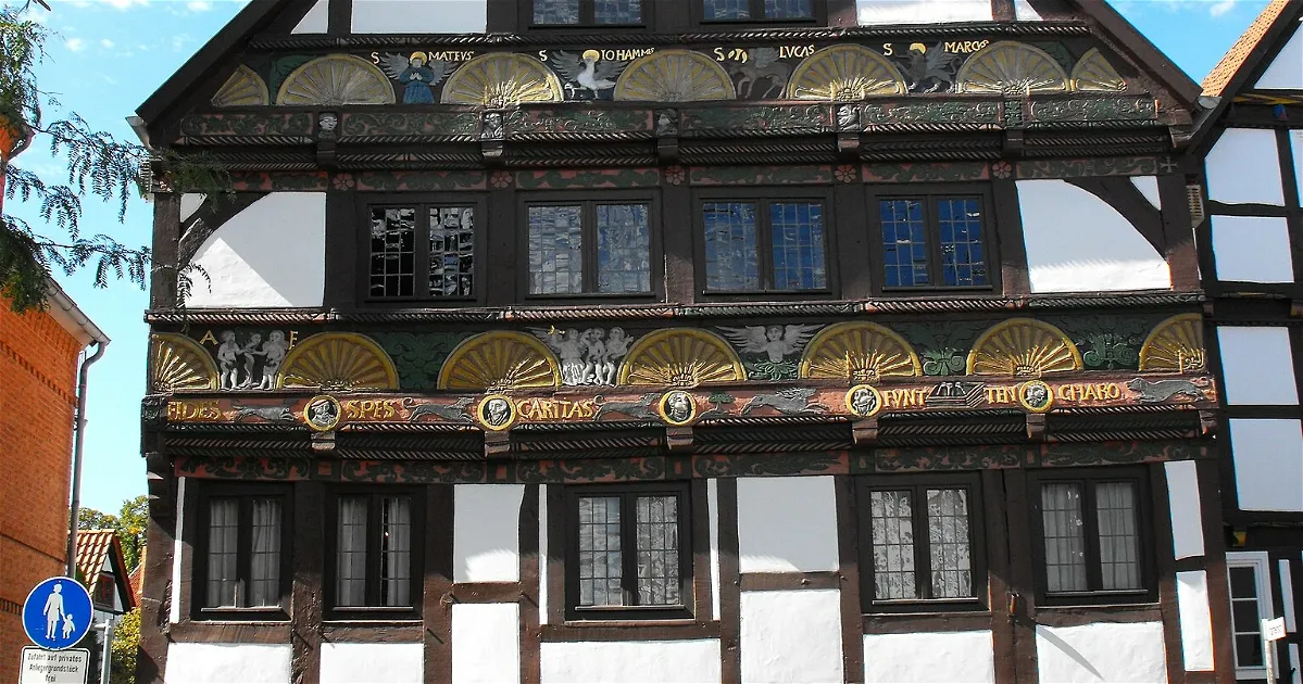 The Adam-und-Eva-Haus, situated at Hathumarstraße 7, is recognized as one of the oldest and most intricately decorated half-timbered houses in Paderborn that still stands today. This three-story gabled house, built around 1560, is particularly known for its rich carvings on the friezes of the gable front.