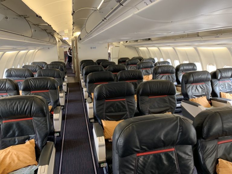 Compared to Turkish's 777, the business-class cabin is far smaller on the A330-300, with just 28 lie-flat seats, 21 fewer than on the 777-300ER. Seats are arranged in a 2-2-2 configuration, which I prefer to the 2-3-2 you'll find on the 777. Since the A330 cabin is narrower, however, the seats measure 21 inches on this plane, compared to 22.