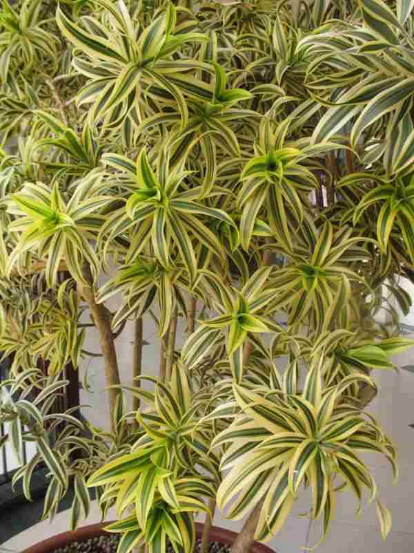 Dracaena reflexa 'Variegata': This variant has bright, lime-yellow leaf margins that contrast with dark green on the rest of the leaf. The foliage's light color matures to a creamy white with age, making the contrast even more prominent. Dracaena reflexa 'Song of Jamaica': This rare variant features stems that grow at unusual angles and bend down as the plant matures.