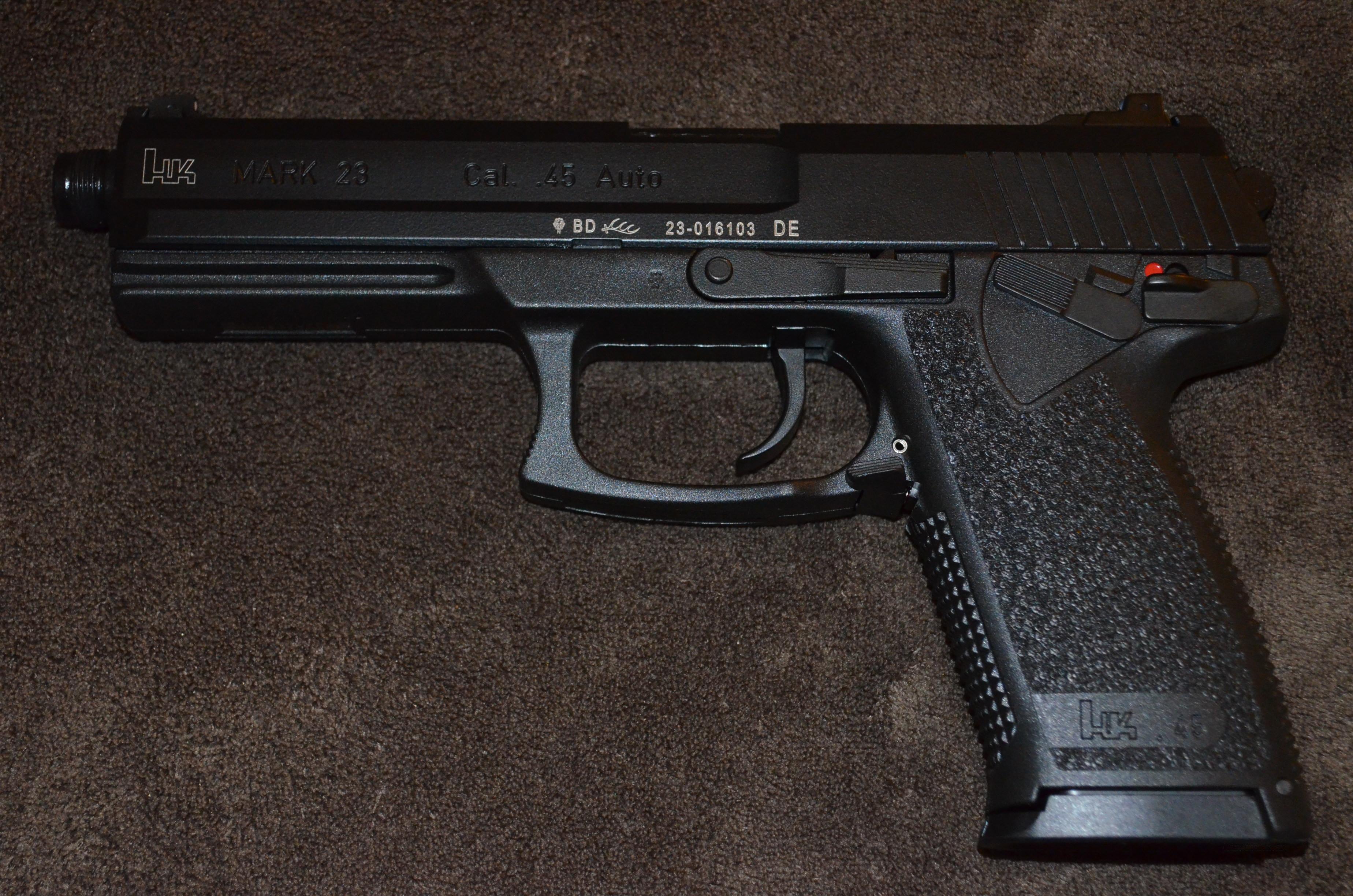 The Heckler & Koch MK 23, MK 23 MOD 0, Mark 23, or USSOCOM MARK 23 is a semi-automatic large-frame pistol chambered in .45 ACP, designed specifically to be an offensive pistol.The USSOCOM version of the MK23 came paired with a laser aiming module (LAM) and suppressor.The USSOCOM MK23 was adopted by the United States Special Operations Command (USSOCOM) for special operations units, beating out.