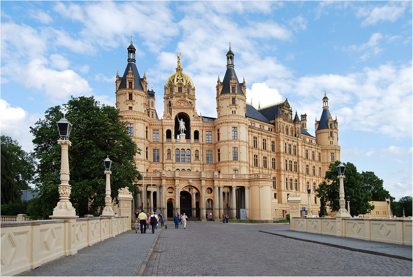 Vom Rande der Altstadt Schwerins in Mecklenburg-Vorpommern sehe ich das malerische Schweriner Schloss mit zahlreichen Türmen und goldenen Kuppeln in den Himmel ragen. Wir erreichen das Schweriner Schloss zu Fuß und bereits der erste Eindruck der Schlossinsel in der mecklenburgischen Hauptstadt begeistert mich.
