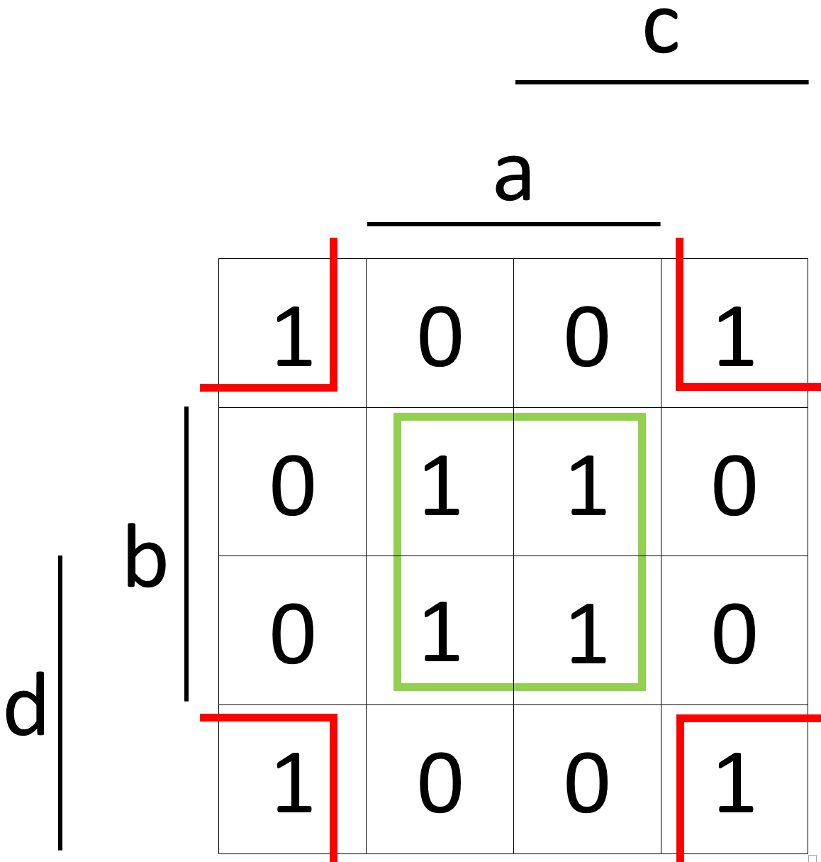 Ab fünf Variablen lassen sich KV-Diagramme nicht mehr in einer Ebene darstellen. Sie bilden Quader mit übereinander liegenden Ebenen.. KV-Diagramme mit zwei Eingangsvariablen sind sehr einfach zu überblicken. Die Skizze zeigt diese KV-Diagramme mit erlaubten Blöcken für Minterme. Optimierte DNF aus dem KV-Diagramm. Es werden Blöcke mit.