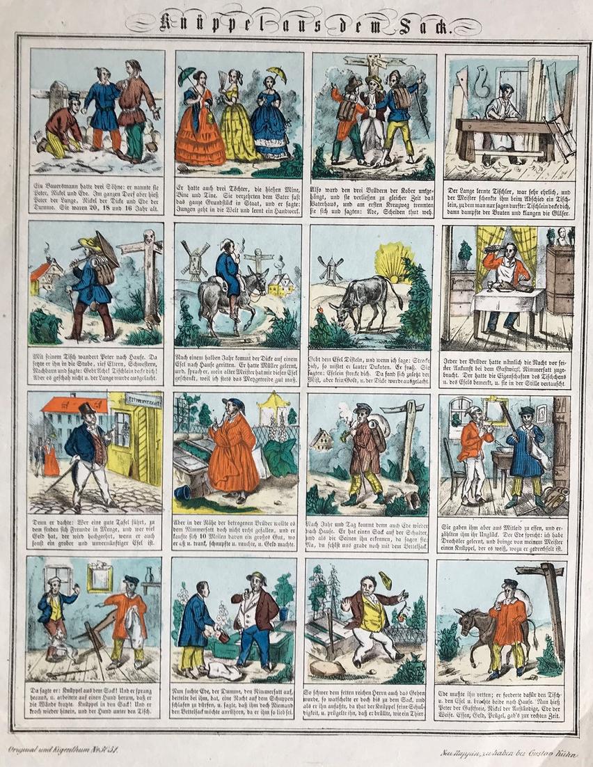 „Hat dir jemand etwas zu leid gethan, so sprich nur: „Knüppel, aus dem Sack," so springt dir der Knüppel heraus unter die Leute und tanzt ihnen so lustig auf dem Rücken herum, dass sie sich acht Tage lang nicht regen und bewegen können; und eher lässt er nicht ab als bis du sagst: „Knüppel, in den Sack.""