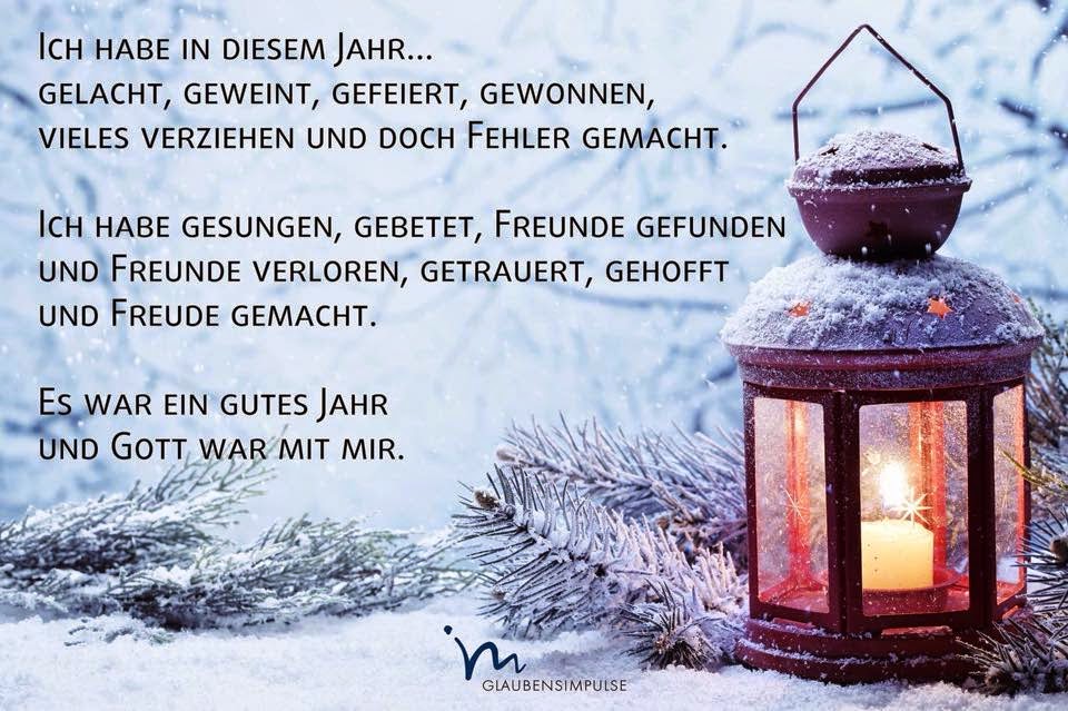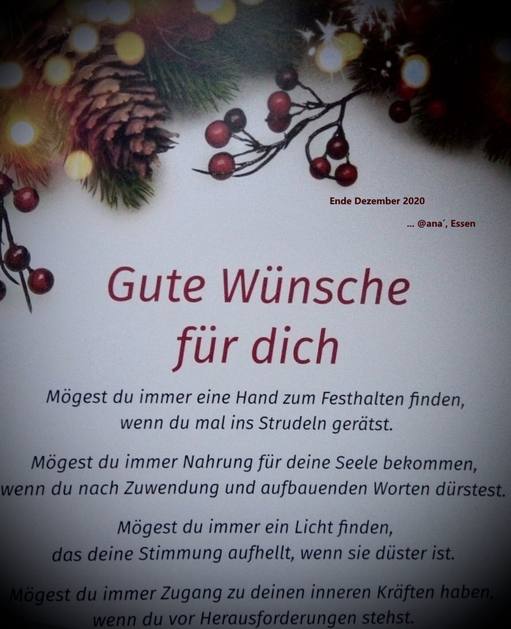 Gottes Segen begleite dich ins neue Jahr. Er sei dir Trost und gebe dir Kraft. auf schwierigen, unebenen Wegen. Er schenke dir Mut und wecke Freude in dir, dass dir Wunderbares gelingen möge. Er erfülle dich mit Liebe. und lasse dich hoffnungsvoll spüren, wer du bist und was du kannst. So segne und behüte dich.