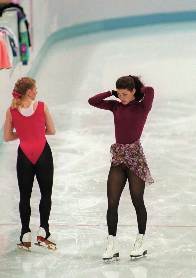U.S. figure skaters Tonya Harding (L) and Nancy Kerrigan avoid each other during a training session on Feb. 17 in Hamar, Norway, during the 1994 Winter Olympics.